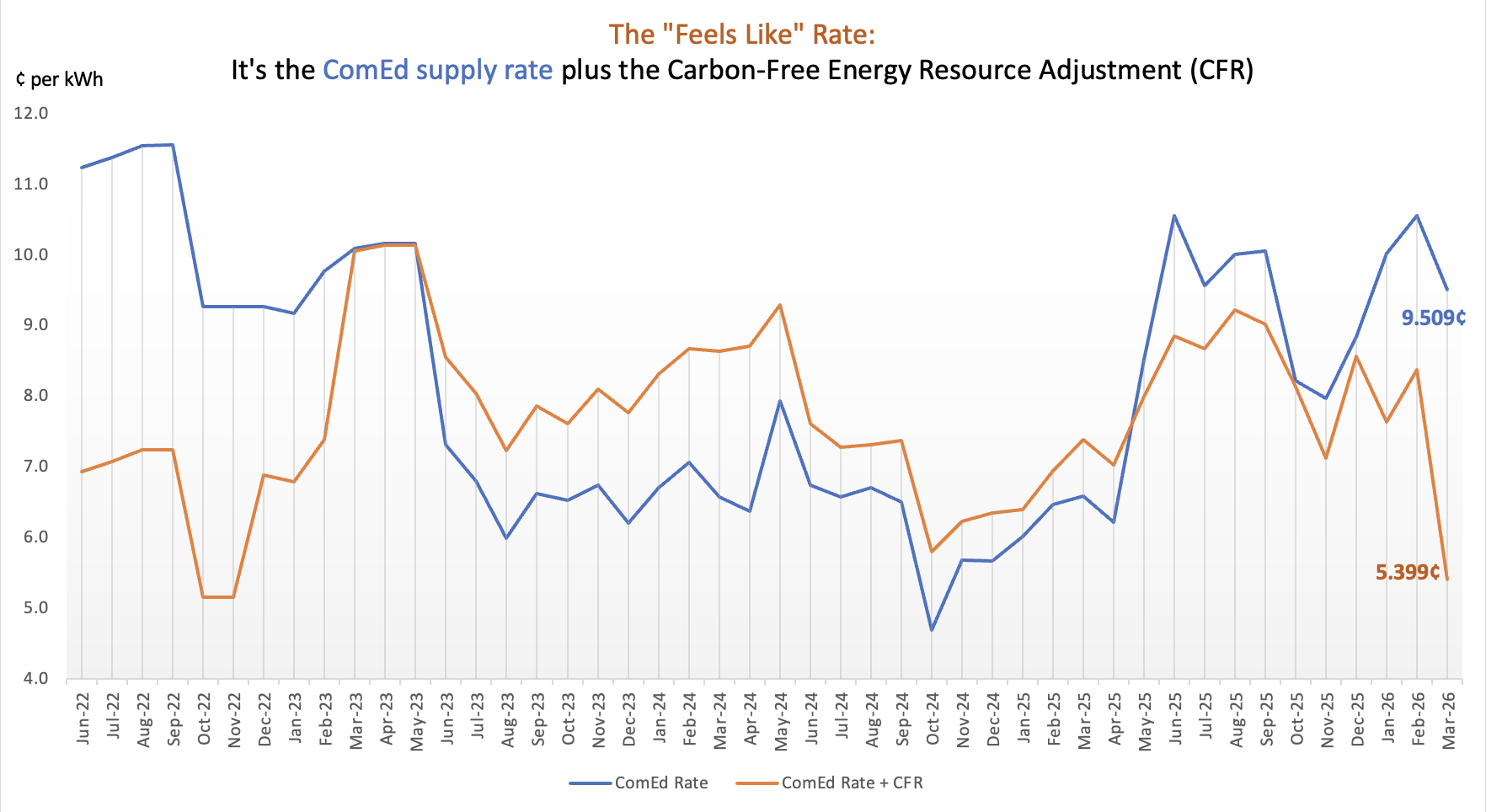 The impact of Rider CFRA: Starting in 2022, in addition to tracking supply costs, it became relevant to track the Carbon-Free Energy Resource Adjustment (CFRA) enacted by CEJA. Because that can have a profound impact in effect, offsetting the supply rate, we track it for you on the “Feels Like” rate chart below. This charge (or credit) is noted under the Taxes & Fees portion of your bill.