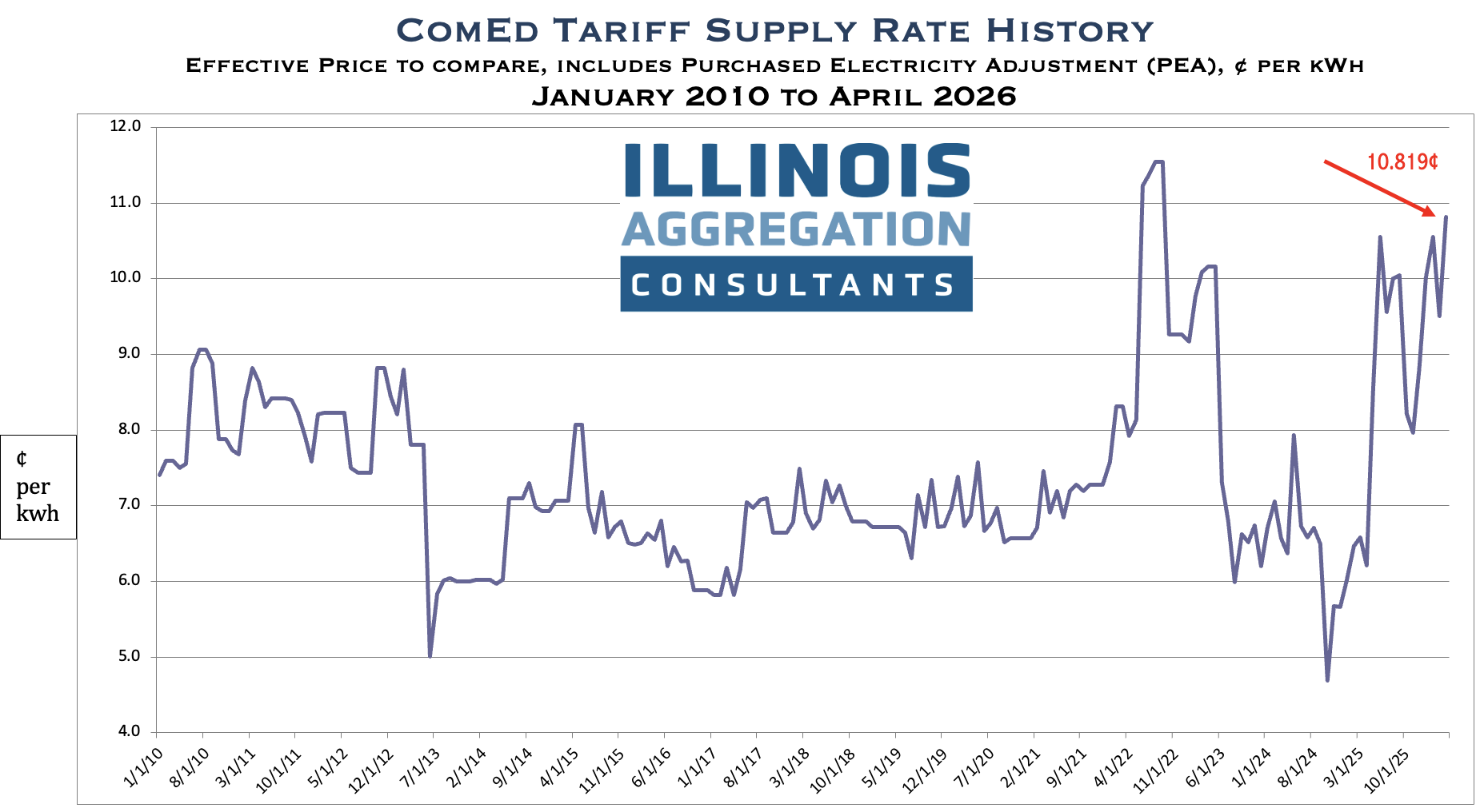 The effective ComEd residential and small commercial retail supply rate will rise from the March rate of 9.509¢ to 10.819¢ in April 2026. This is comprised of the non-summer base rate of 9.66¢ plus an April Purchased Electricity Adjustment (PEA)* charge of 1.159¢.