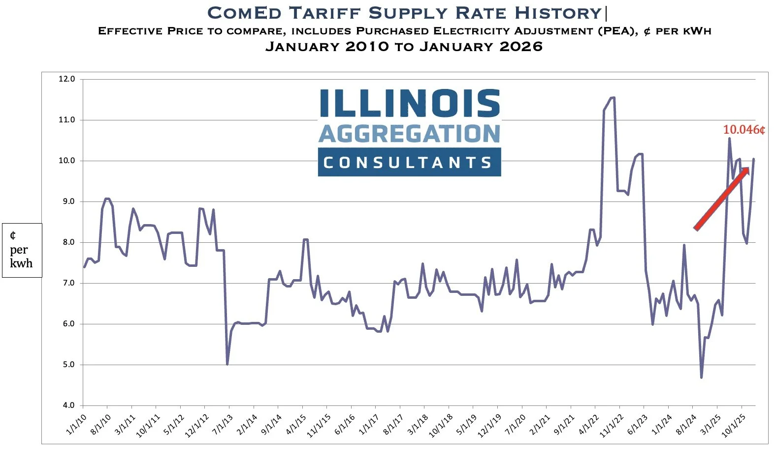 The effective ComEd residential and small commercial retail supply rate rises 26% in just two months’ time, from the November rate of 7.968¢ to 10.046¢ in January 2026. The rate is comprised of the non-summer base rate of 9.689¢ plus the January Purchased Electricity Adjustment (PEA)* charge of 0.357¢.