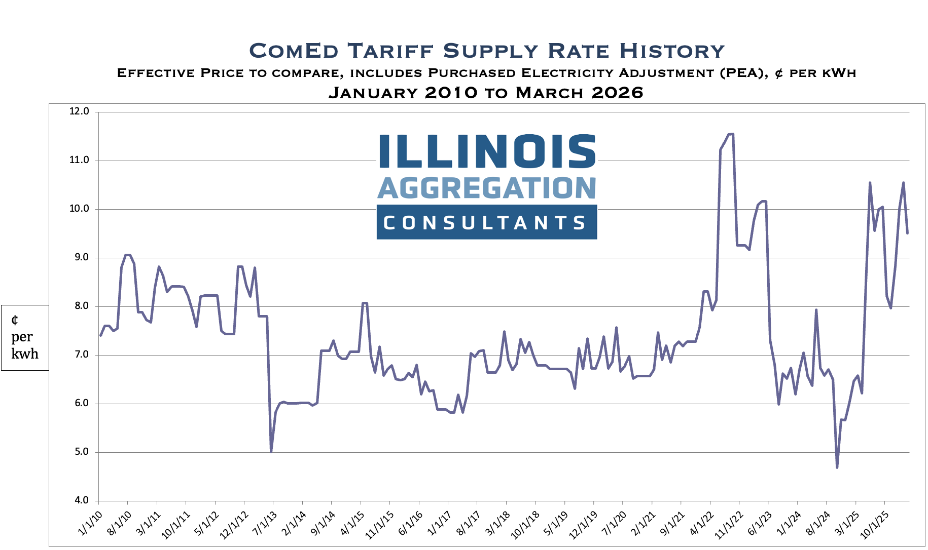 The effective ComEd residential and small commercial retail supply rate will decline from the February rate of 10.549¢ to 9.509¢ for March 2026. This rate is comprised of the non-summer base rate of 9.66¢ plus a March Purchased Electricity Adjustment (PEA)* credit of 0.151¢.